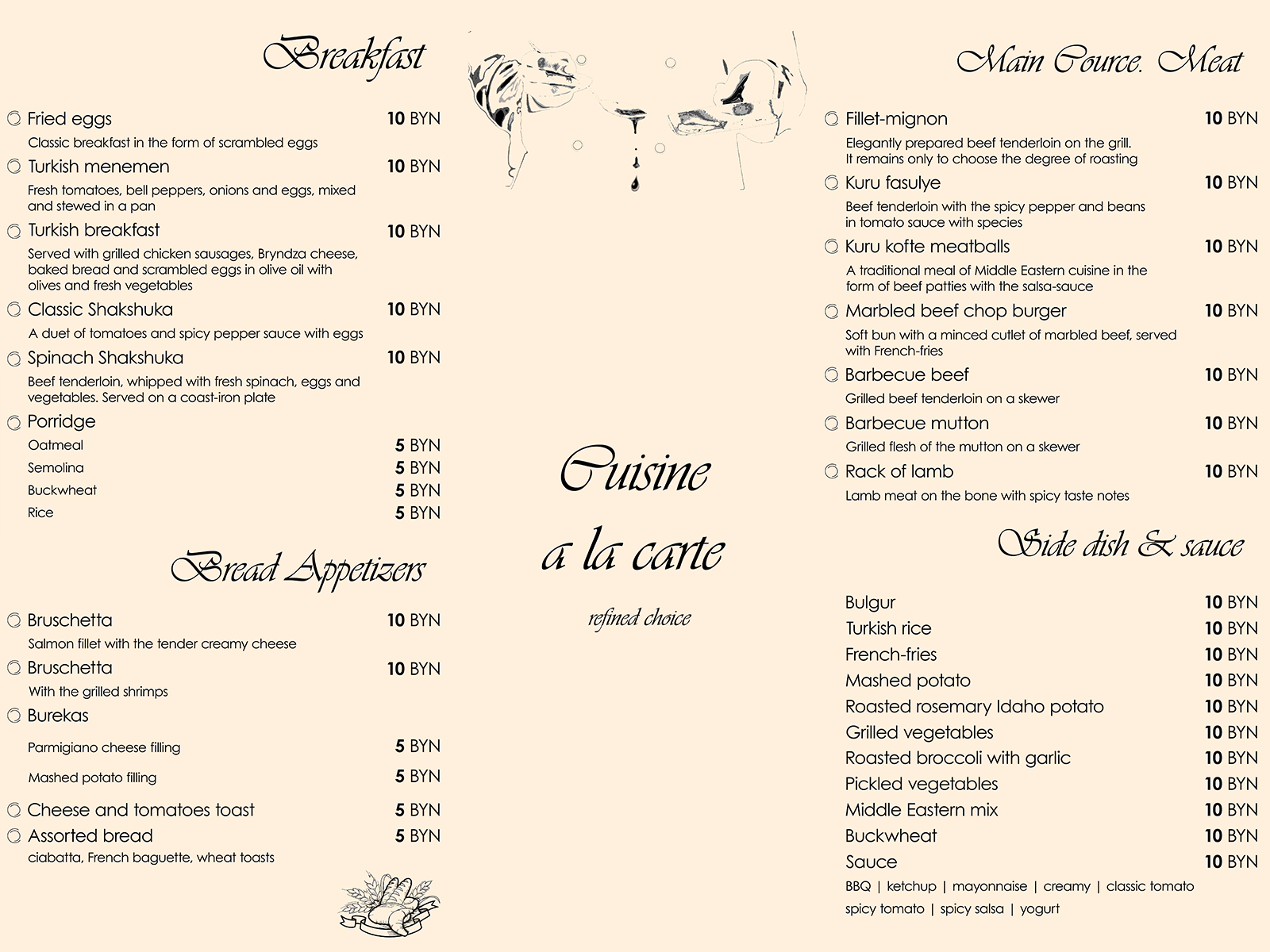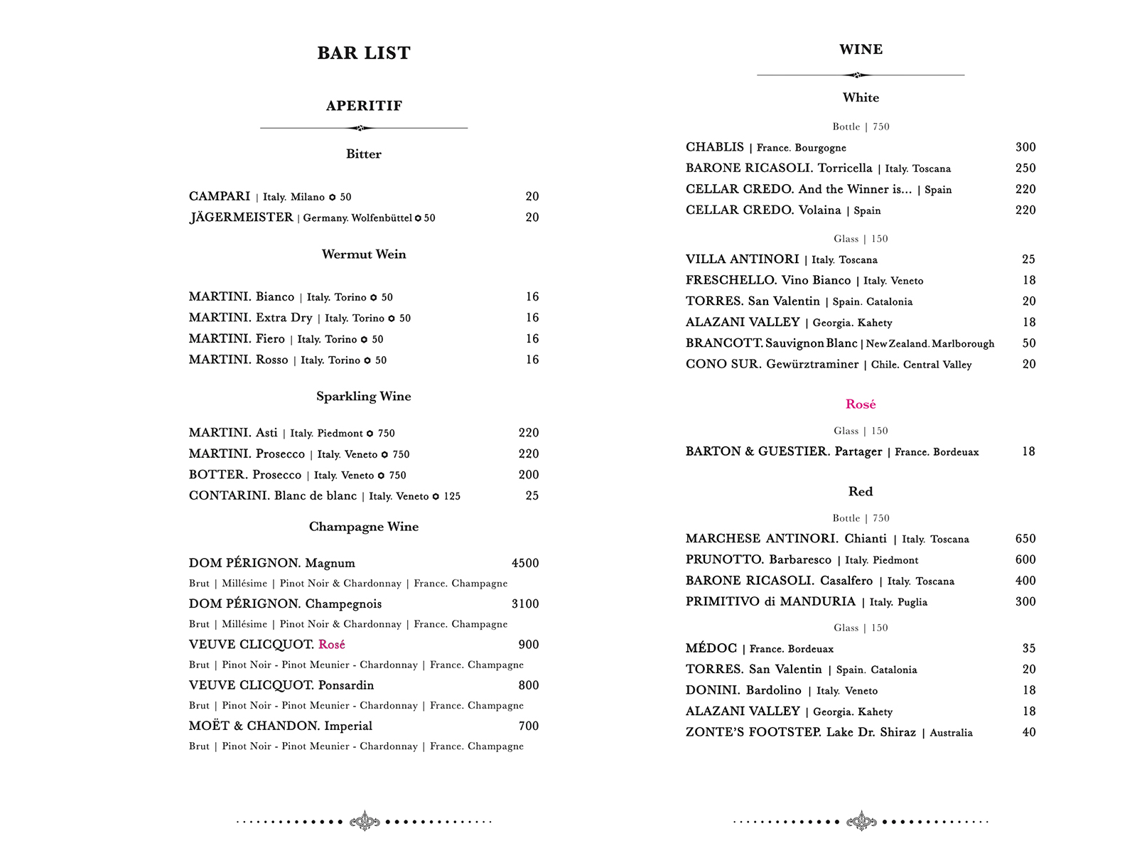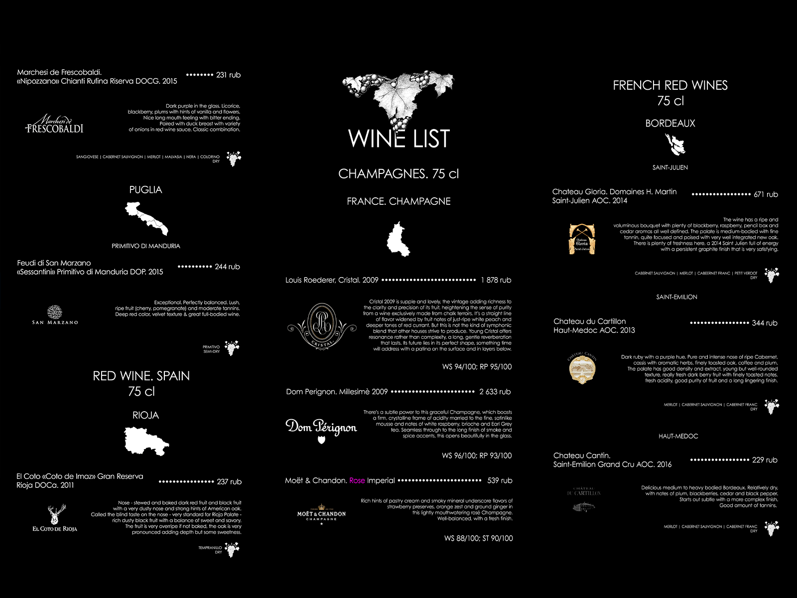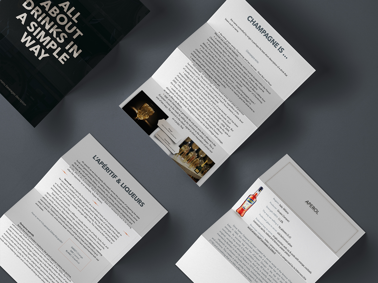 The lounge menu using corporate colors and fonts has been created with an emphasis on the bar assortment and its description: all drinks are arranged in a strict hierarchy of categories and flavors.