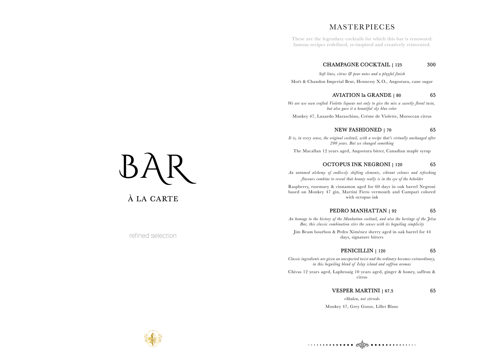 Travel Edition is the name of the menu, which is the quintessence of the main meaning of the appearance of hotels: guests from all over the world can stay at the hotel, the bar menu of which consists of drinks produced in different parts of the world, which are also tourists of some kind. The 79 vertical stripes on the menu cover symbolize the serial number of the 60-year cycle in the Chinese calendar. The menu is designed according to the notebook principle, when the next odd page is wider than the previous one, which makes it easy to get to the menu category of interest.