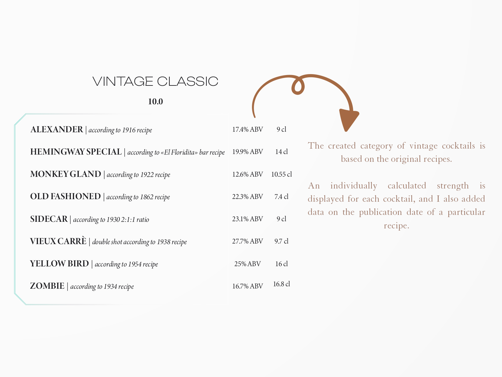 By building on a Node.The JS page of the QR menu, which I later integrated into a website written in PHP, was my goal, not only to give guests a standard opportunity to easily familiarize themselves with the bar's assortment, but also to get basic information about each of the more than 200 drinks, so I added unique information about each of them.