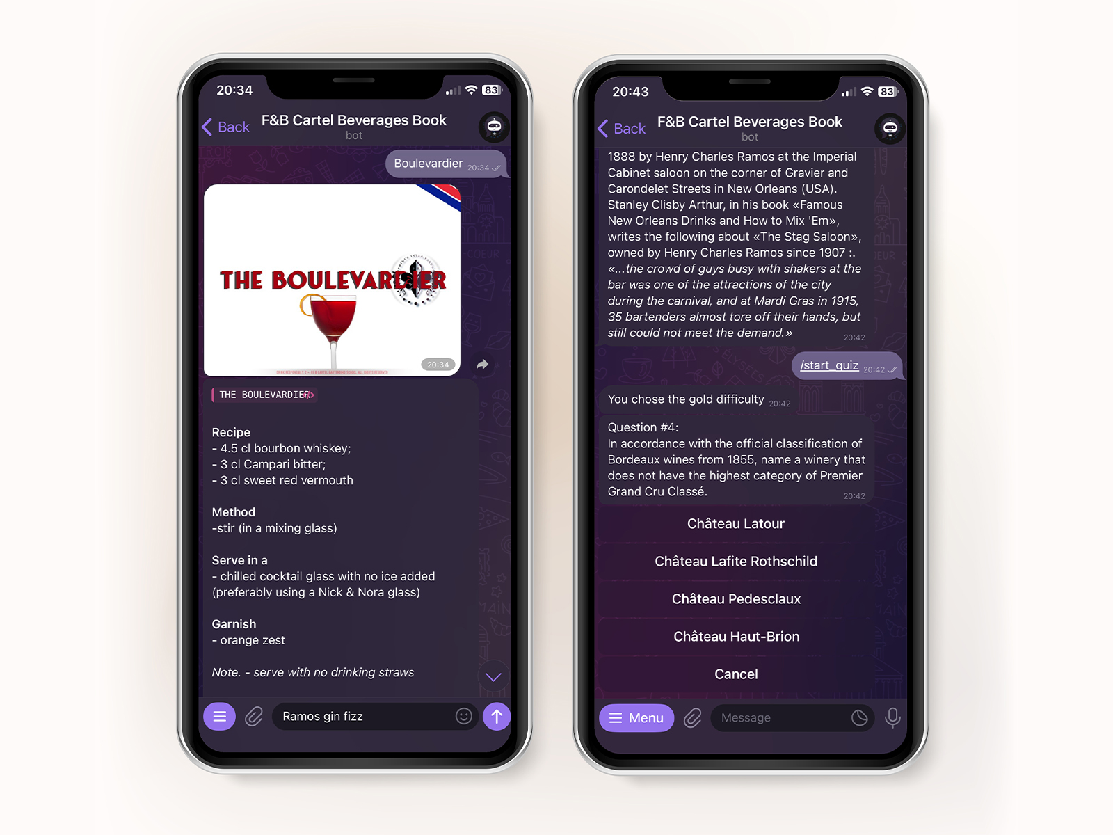An international cocktail assistant in Telegram — supporting multiple languages, it helps bartenders mix drinks, sharpen their knowledge with quizzes, and explore curious facts from the hospitality industry.